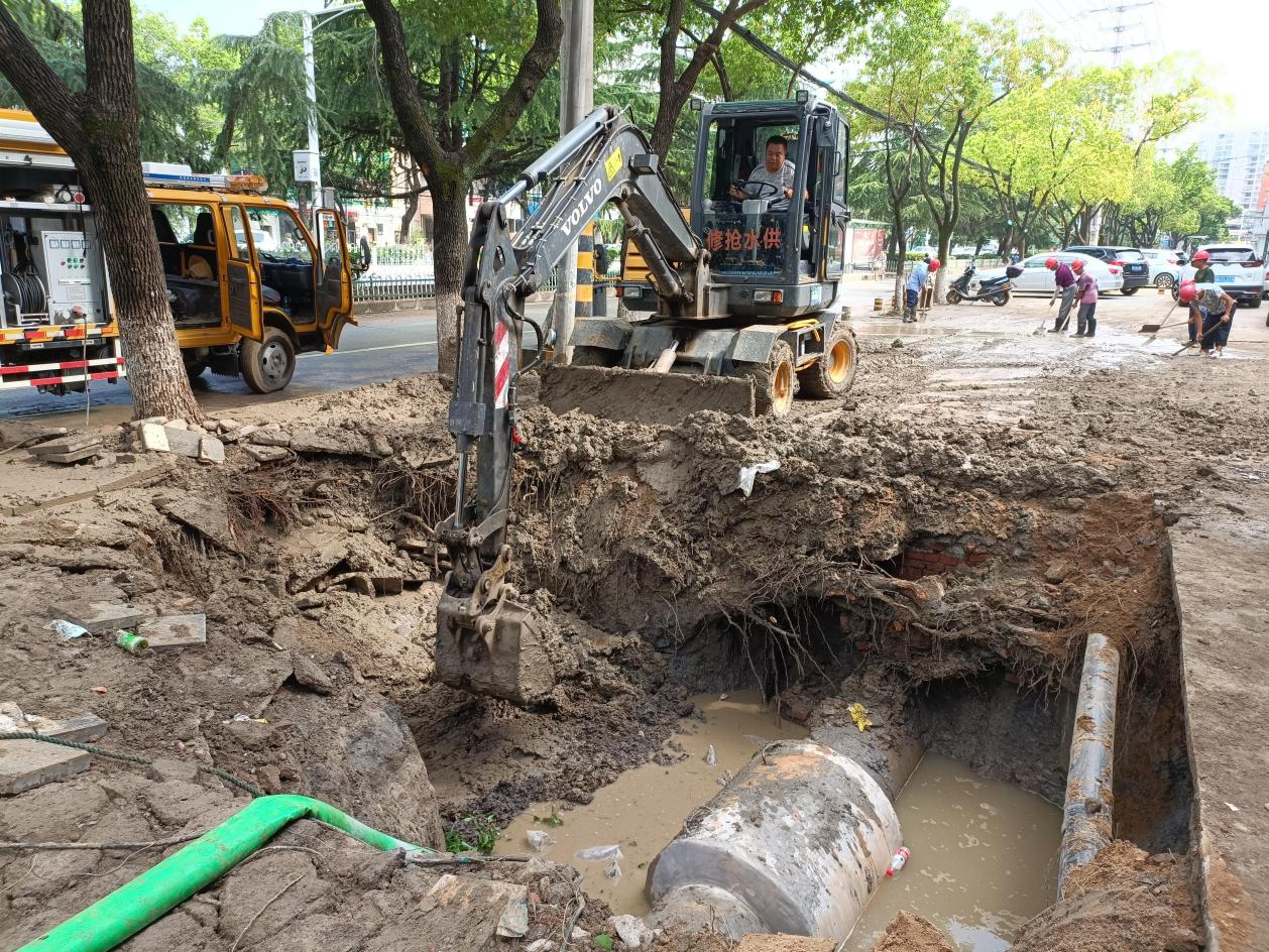 在搶修現場看到,公司副經理曾國剛、運維部部長劉要華正在組織工作人員設置路障,指揮挖掘機開挖路面、清理淤泥。2輛搶修車停在路邊,保障后勤需要,10余名工作人員正在分工明確地投入到緊張的搶修中。