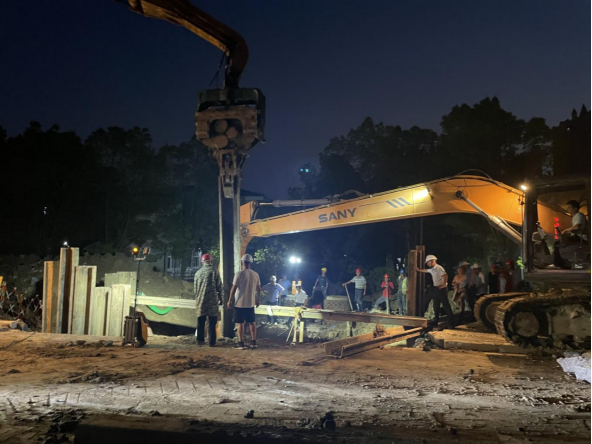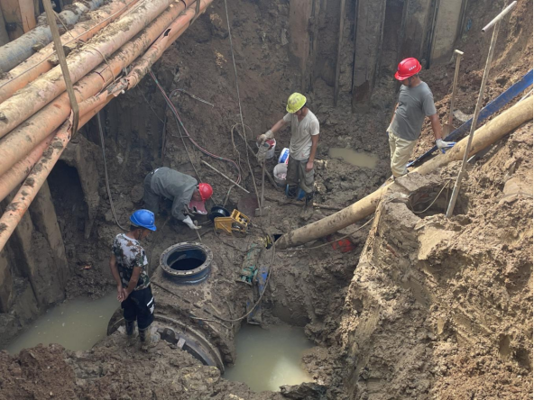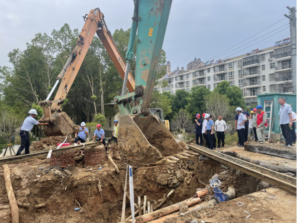 晚上9點,公司第一時間派出10余名搶修人員迅速到場關(guān)閘止水,三水廠暫停供水。與此同時,技術(shù)人員、施工人員和設(shè)備設(shè)施“跑步前進(jìn)”、同步到場,對破損溢水點進(jìn)行邊開挖、邊診斷。由于情況復(fù)雜,晚上24點,3臺大型挖機(jī)、樁機(jī)進(jìn)場,20余人到場增援,清理作業(yè)面。市政府組織市住建局、澴川國投、供電公司、燃?xì)夤炯纯探M成技術(shù)專班,會同公司技術(shù)人員和一線工人現(xiàn)場制定搶修方案。
