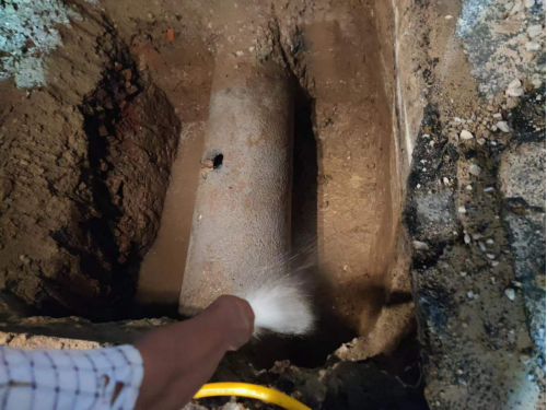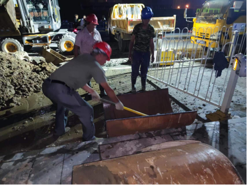 在快速挖開路面找出供水主管道后,經(jīng)技術(shù)人員現(xiàn)場分析判斷,確定此次DN600供水主管道被施工損壞是因孝武大道道路改造施工導(dǎo)致,其施工人員操作啄木鳥時不慎將水泥供水管道挖破。隨后技術(shù)人員迅速制定了維修方案,即采用DN800鋼管抱箍,快速水泥填充的方式修復(fù)。為縮減搶修時間,運行維護部共派出各類工程車輛5輛,搶修人員18名參與到此次搶修任務(wù)中。盡管已到深夜,氣溫仍接近30攝氏度,但搶修人員不顧疲勞和炎熱,搶時間、趕進(jìn)度,通宵作戰(zhàn),終于在11日早上6點完成搶修任務(wù),順利通水。